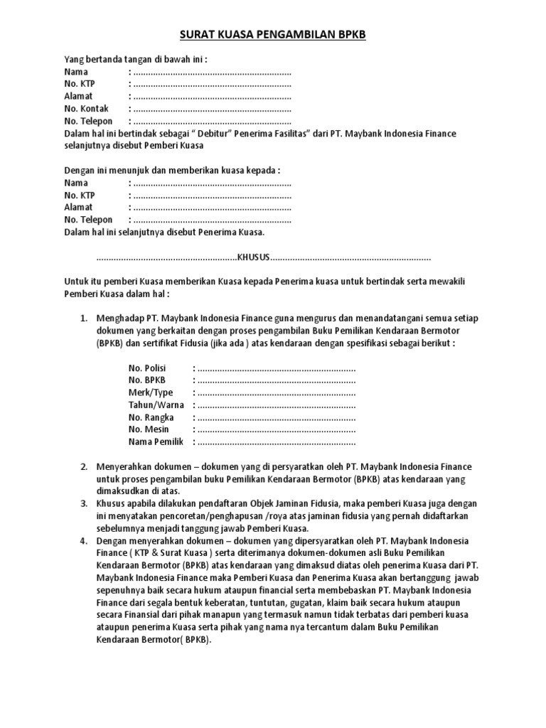Cara membuat surat kuasa pengambilan bpkb mobil dapat anda buat secara mandiri. Surat kuasa jual beli kendaraan bermotor. Penerbitan bpkb dilaksanakan oleh satuan lalu lintas kepolisian negara republik indonesia. Jika anda membeli kendaraan bermotor dari showroom atau dealer, maka tentu akan mendapatkan bpkb sebagai bukti kepemiliki anda atas kendaraan bermotor tersebut. Setelah anda mengetahui tentang surat kuasa pengambilan bukti kepemilikan kendaraan bermotor (bpkb) maka selanjutnya anda bisa membuatnya sendiri.